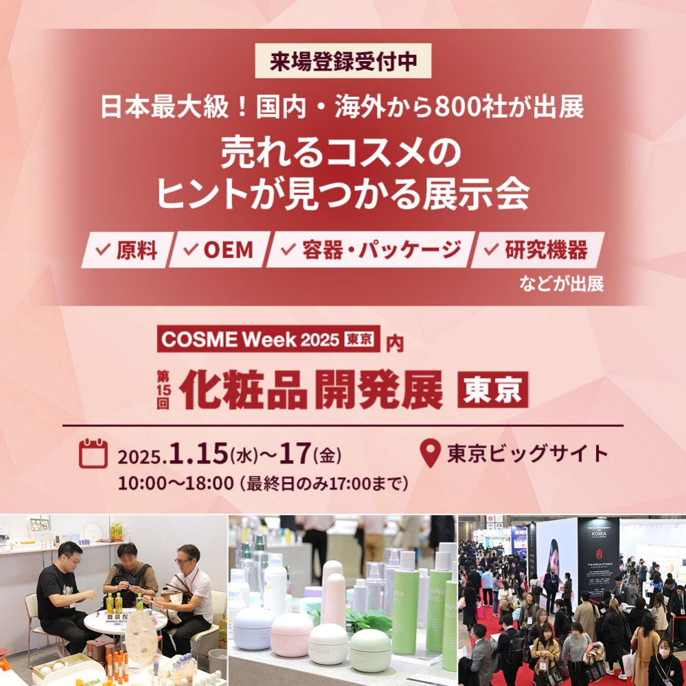 COSME Week 【東京】は、開発向け製品・技術からコスメ・美容商材の完成品まで、一堂に集結する展示会です。