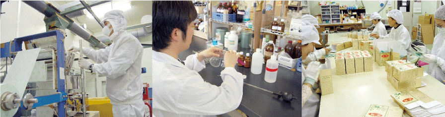 特に生薬を活用したもの創りに力を入れ、生薬の成分で人間本来の持っている自然治癒力を高め身体に負担の少ない製品開発にこだわっています。使用原料も質の良いものを世界中から集めています。たとえば生薬、刻み方や産地で成分や、香りが違います。これらの特長をいかして納得行くまで試作を繰り返し、丹精込めた製品をお客様へご提供いたします。